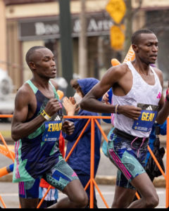 Gabriel Geay (right) with Evans Chebet (the eventual winner) at the Boston Marathon – photo @gabrielgeraldgeay