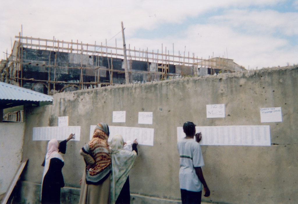 9.00am. Raha Leo polling station. Voting proceeding slowly and peacefully. We notice that the ‘Permanent Voters Register’, which CUF has been a demanding to see for weeks, has finally been pasted on the walls of the polling station on a series of A4 sheets of paper. A few people complain that they have voting cards but are not on the list and are not allowed to vote. Observers much in evidence with the word ‘Observer’ prominently displayed on all their backs.